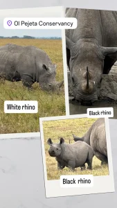 While at Ol Pejeta Conservancy, we were privileged to witness both white and black rhinos in their natural habitat—an increasingly rare and awe-inspiring sight. Rhinos are solitary creatures by nature and, interestingly, do not interbreed across species.